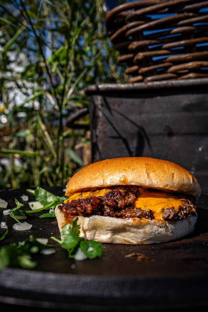 Double pattie Black Angus burger met cheddar cheese sauce en bacon jam op een brioche bun.