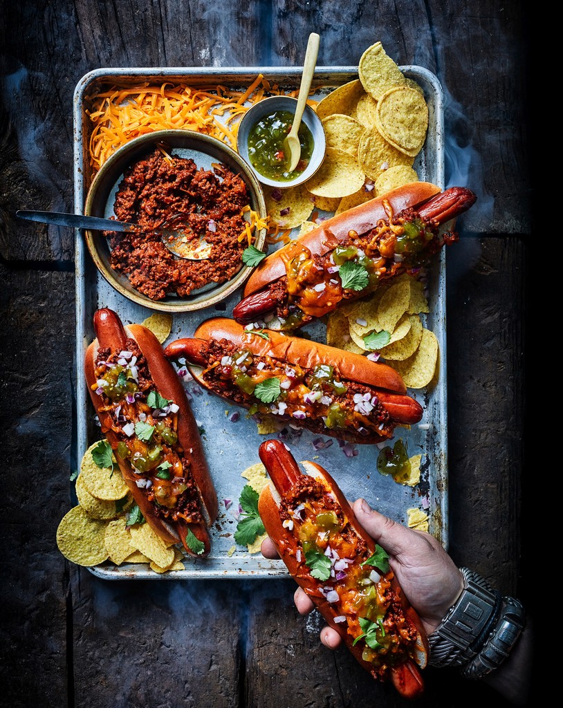 Smoked hot dog loaded met beef chili, cheddar cheese, jalapeño relish en nacho crumble.